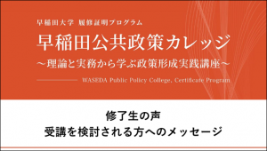 2025年4月に初回開講しました履修証明プログラム「早稲田公共政策カレッジ―理論と実務から学ぶ政策形成実践講座」の第2期を2026年4月より開講いたします。