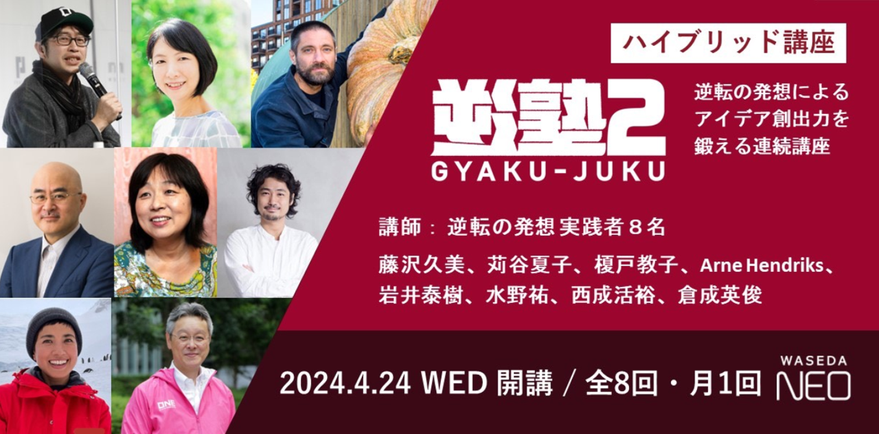 「逆塾」とは、発想、逆張り、逆走、逆手に取る、など、「逆」について学ぶ、特別講座です。早稲田NEOにて第1期2022年1-11月、第2期2024年4-12月と行い、2回とも募集早々に満員となりました。